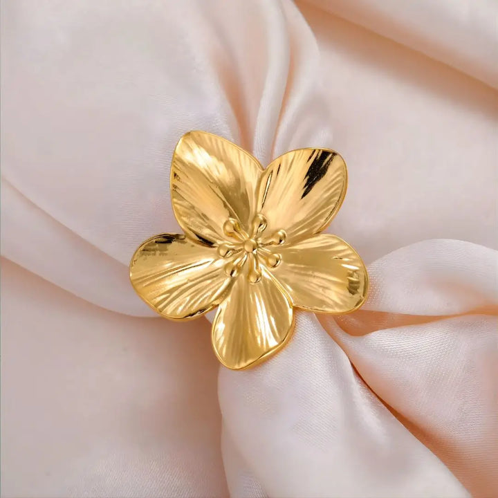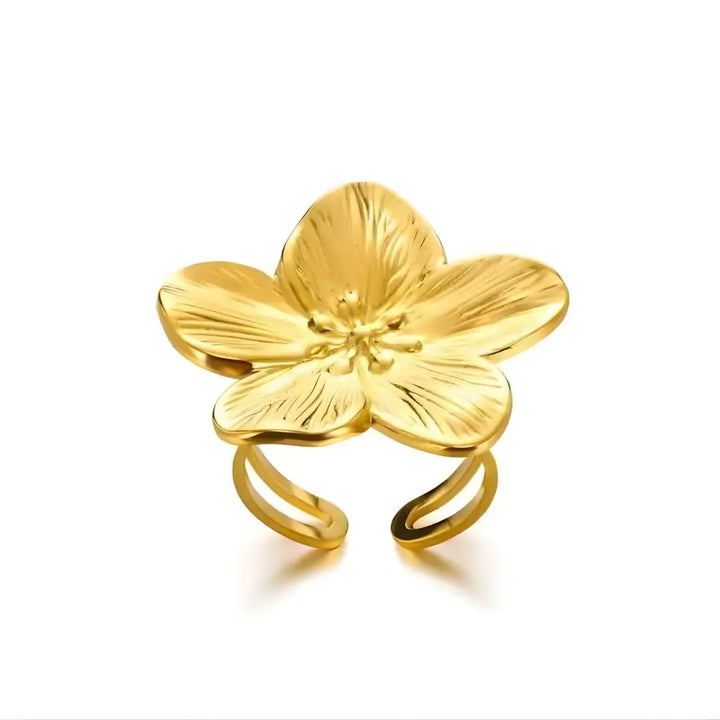 Produzido em aço inoxidável com banho de ouro 18K, este anel reflete brilho e durabilidade excepcionais. O formato de flor, com traços sutis e acabamento polido, traduz feminilidade com um toque contemporâneo.