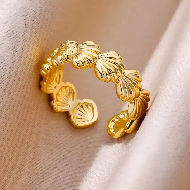 Com acabamento texturizado que remete às conchas do oceano, o Golden Shells é produzido em aço inoxidável banhado a ouro 18K, garantindo durabilidade, brilho intenso e conforto no uso diário. Seu formato ajustável se adapta com elegância a qualquer dedo.