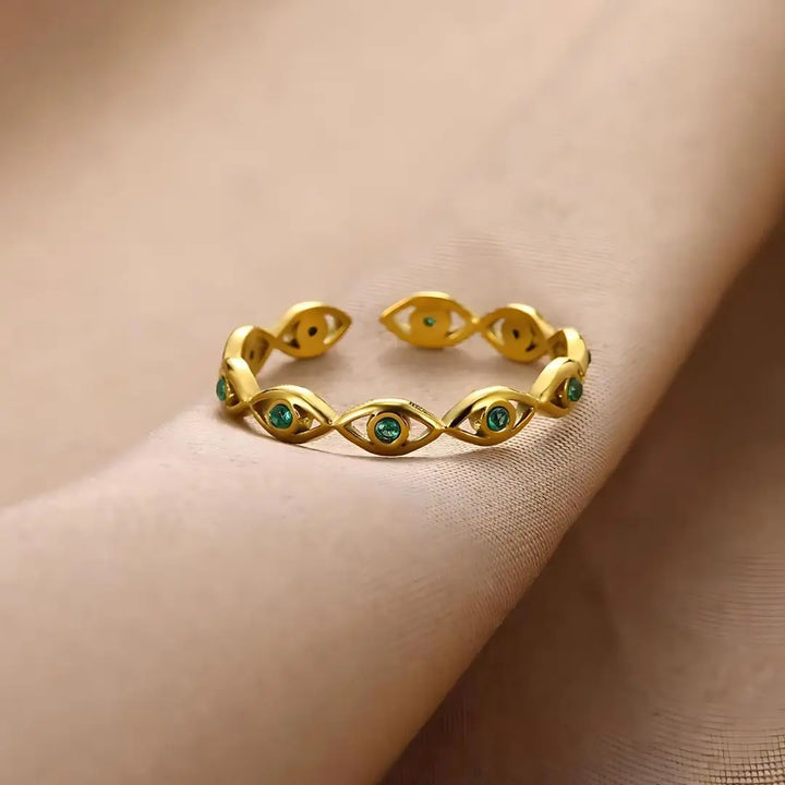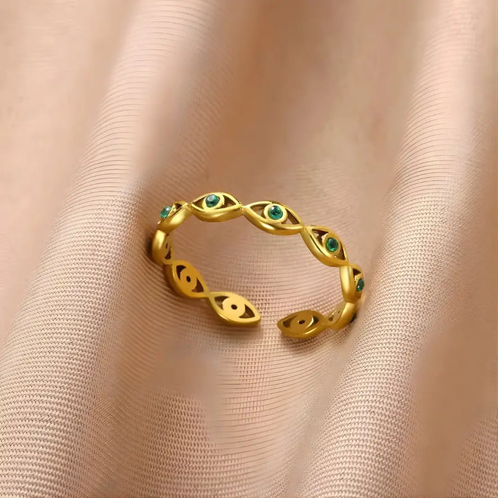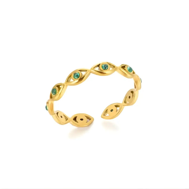 Produzido em aço inoxidável banhado a ouro 18K, este anel combina brilho intenso com alta durabilidade. O design em formato de “olhos estilizados” representa intuição, proteção e charme — um símbolo perfeito para mulheres que confiam na própria luz.