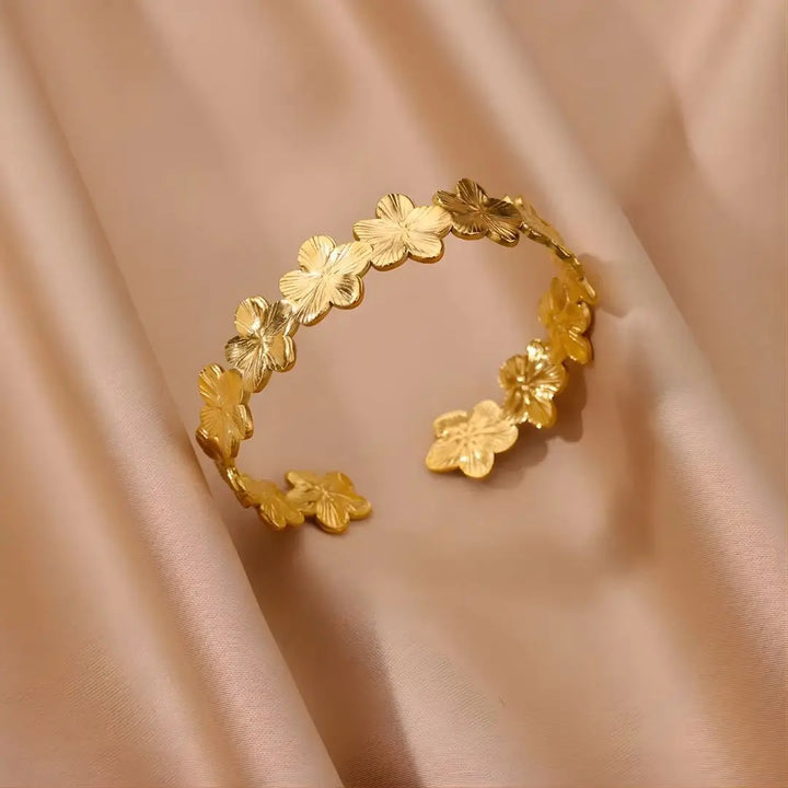 O Bracelete Dourada Flowers celebra a delicadeza e o charme natural das flores em um design sofisticado e feminino. Ideal para mulheres que amam joias com personalidade, ele combina leveza, brilho e elegância em uma peça única.