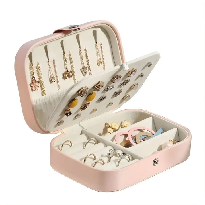 Com acabamento em couro sintético rosa-claro, o Amaya traz um toque romântico e moderno. Seu interior aveludado garante que suas peças fiquem protegidas contra riscos e oxidação, enquanto os compartimentos internos permitem guardar brincos, colares, pulseiras e anéis de forma prática. O fecho em zíper completa o design com segurança e elegância.